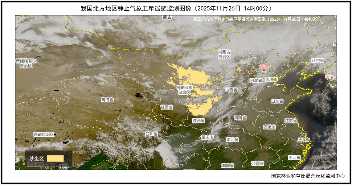 11月26-28日,受冷空气大风影响,我国新疆南疆盆地及东部、甘肃河西走廊、内蒙古中西部、宁夏、陕西、山西、河北中南部、北京西部、河南、山东西部、安徽中北部、江苏、上海以及浙江北部等地出现扬沙或浮尘天气。其中,甘肃民勤出现沙尘暴,最低能见度500米;内蒙古吉兰泰发生强沙尘暴,最低能见度仅200米。