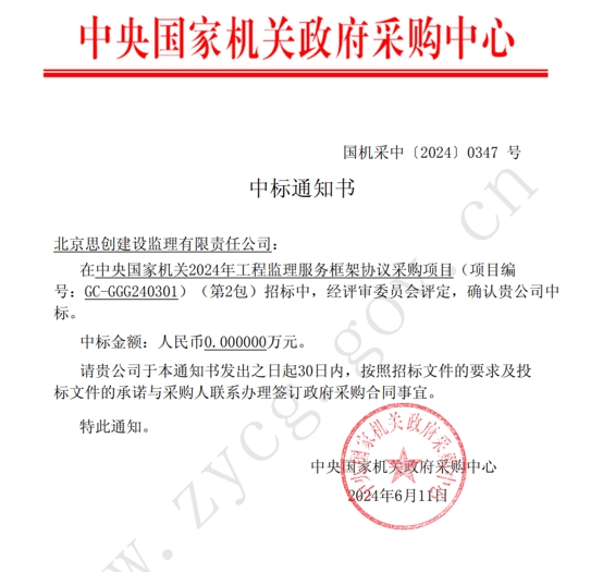6月12日,北京思创建设监理有限责任公司参加中央国家机关政府采购中心的中央国家机关2024年工程监理服务框架协议采购项目(项目编号:GC-GGG240301),确定入围2024年工程监理服务框架协议。