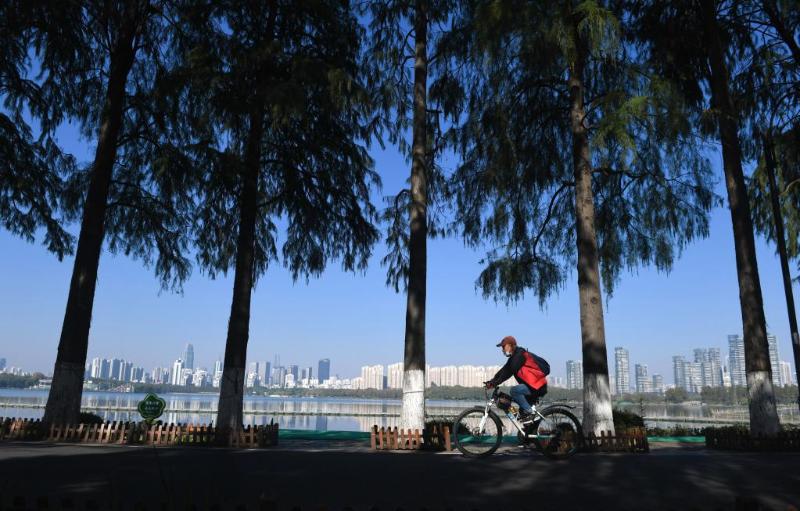 市民在武汉东湖绿道骑行休闲。新华社记者 程敏 摄