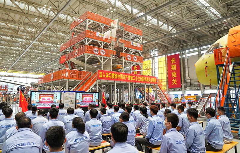 10月16日,在中国商飞上海飞机制造有限公司总装车间,员工们在收看中国共产党第二十次全国代表大会开幕会。新华社记者 丁汀 摄