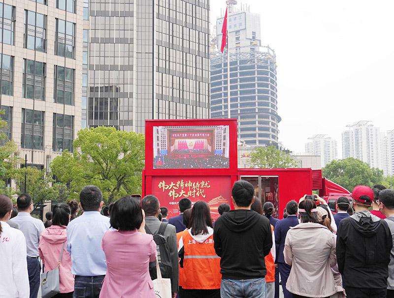 10月16日,在上海中共一大纪念馆前,工作人员、志愿者和观众在收看中国共产党第二十次全国代表大会开幕会。新华社记者 刘颖 摄