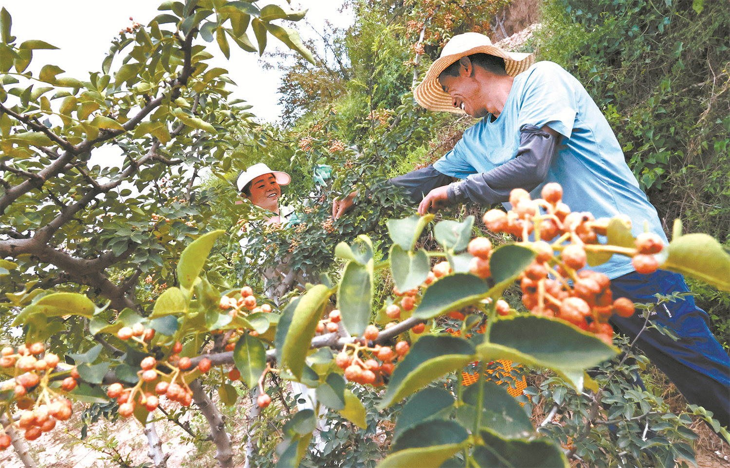 初秋时节,山西省运城市新绛县姑射山下范庄新村等村庄引进改良的无刺大红袍、狮子头等花椒品种迎来采收季,椒农加紧采摘销售,确保丰产增收。
