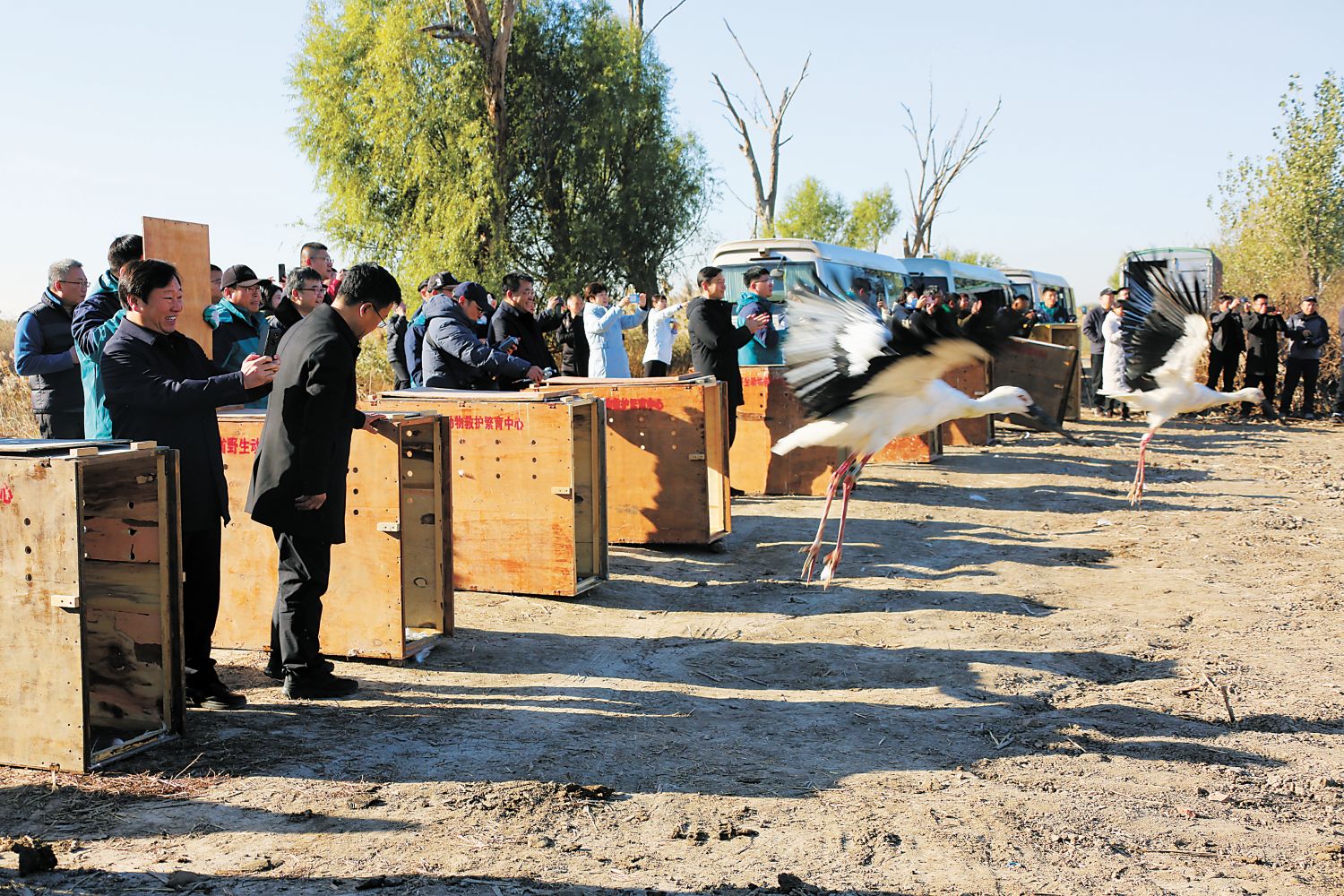 随后,这群过客重新踏上南迁之路。在此期间,有11只东方白鹳被留下救治,并最终恢复健康。经专家论证,吉林省林草局决定护送它们前往天津七里海湿地,与迁徙大部队会合。11月16日晚,11只掉队“国宝”跨越1100公里,历时15个小时,终于归队。