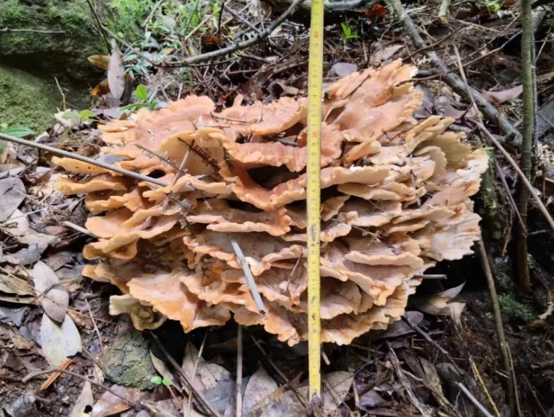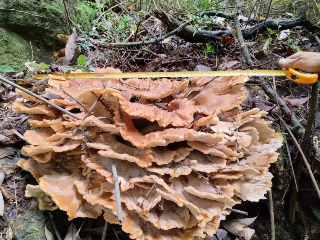马关县老君山省级自然保护区管护分局工作人员巡护到麻栗坡、马关老君山省级自然保护区1800米海拔区域时,在比较潮湿森林大树下发现一株野生菌,通过测量该野生菌宽70厘米、高30厘米,是目前文山州马关县区域范围内发现的最大野生菌,通过中国科学院昆明植物研究所的专家鉴定,该野生菌是疣孢孔菌(Bondarzewia sp),幼嫩时可以食用。