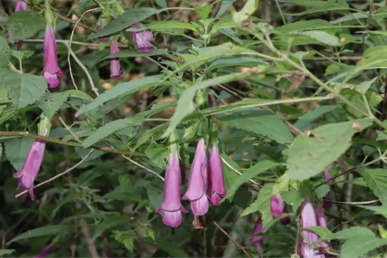 其紫红色花朵尤为醒目,聚伞状花序,几全部生叶腋中,通常为2花。花冠长约5厘米,下唇明显长于上唇。花冠筒长约3厘米,伸出萼筒许多,喉部膨大,外部密被白色绒毛,内面无毛,沿下唇中轴线生不规则斑点。幼时为紫红色,与茎同色,成熟后变绿。花期为9月-10月,分布于谷城县及神农架林区海拔570米左右的山谷及具有湿润肥沃土壤的灌丛中。