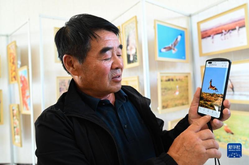 廷·巴特尔展示在自家草场拍摄的野生动物(9月8日摄)。新华社记者 刘磊 摄