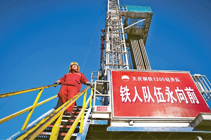 奋斗的红旗永不褪色,铁人队伍永向前。图为大庆油田1205钻井队钻井工人在野外钻井平台作业。 新华社记者 王松/摄