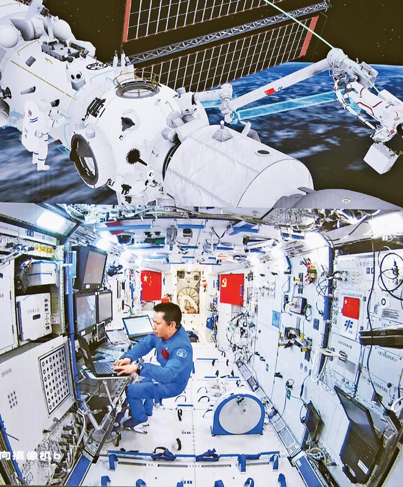 在长期的奋斗中,我国航天工作者铸就了“特别能吃苦、特别能战斗、特别能攻关、特别能奉献”的载人航天精神。上图为2021年8月20日,神舟十二号乘组两名航天员再次成功出舱。下图为在北京航天飞行控制中心大屏拍摄的神舟十二号乘组航天员汤洪波核心舱内的工作场景。 新华社记者 田定宇/摄