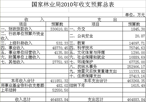 国家林业局2010年部门预算收入总计464883.84万元,其中:财政拨款330610.81万元,上级补助收入532.33万元,事业收入48770.45万元,事业单位经营收入4135.8万元,附属单位上缴收入50万元,其他收入27751.93万元,用事业基金弥补收支差额482.02万元,上年结转52550.5万元。