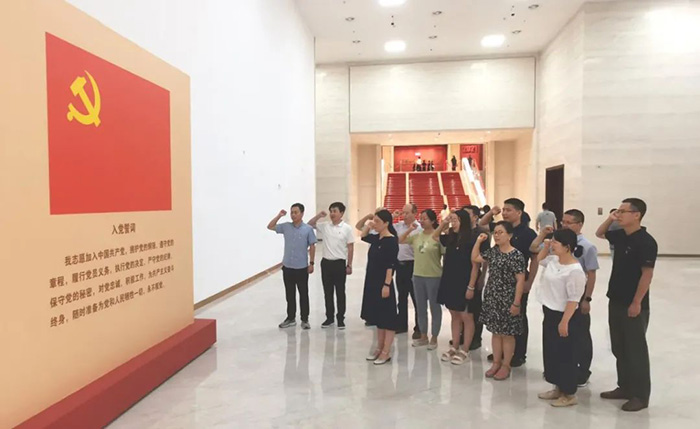 在宣誓大厅,中心党支部副书记、副主任孙鸿雁带领全体党员高举右拳宣读入党誓词,重温入党时的庄严承诺,并要求全体党员在工作和生活中,不忘初心、牢记使命,永葆共产党员的政治本色。