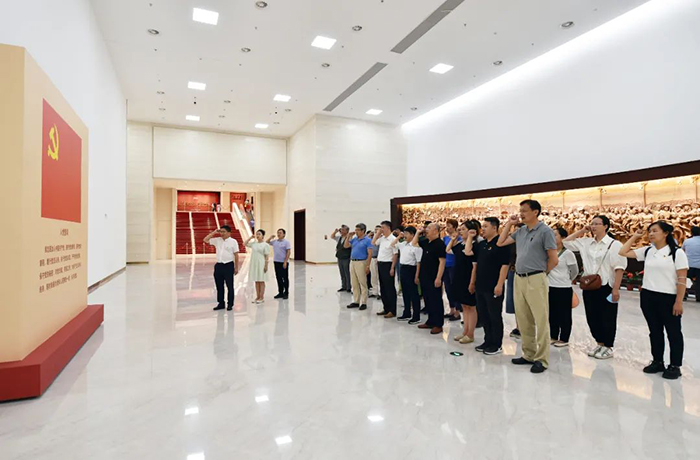 参观结束后,全体党员来到宣誓大厅,面向鲜红的中国共产党党旗,举起右拳,重温入党誓词。
