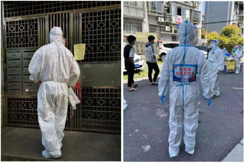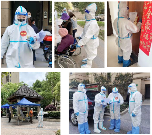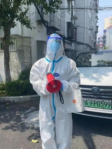 吴晓妹做为专员办第一党支部一名普通党员,3月25日向徐汇区千鹤六组居委会报道,申请加入了社区志愿者队伍。她负责防疫政策宣传、核酸检测扫码、抗原发放统计、居民物资派送分发及居委会日常工作辅助等工作。因被防护服层层包裹,要大声说话才能让面前的居民听见,一天下来,嗓子早已沙哑。对不懂智能手机操作、无法调取核酸二维码的老人,她便帮他们打印纸质版核酸码,让老人随身携带,避免了核酸现场让志愿者帮忙在手机上操作造成的近距离接触。为了实现核酸检测不漏一户、不落一人、结果精准,她对居民楼进行了反复确认摸排后,建立了核酸检测通知群,重新完善了基础数据,确定了楼里现有住户和总人数,制作了核酸检测统计表及物资分发统计表等一系列表格,用笔写满了注意事项与执行要则。正如她所说:“奉献青春力量我义不容辞。”