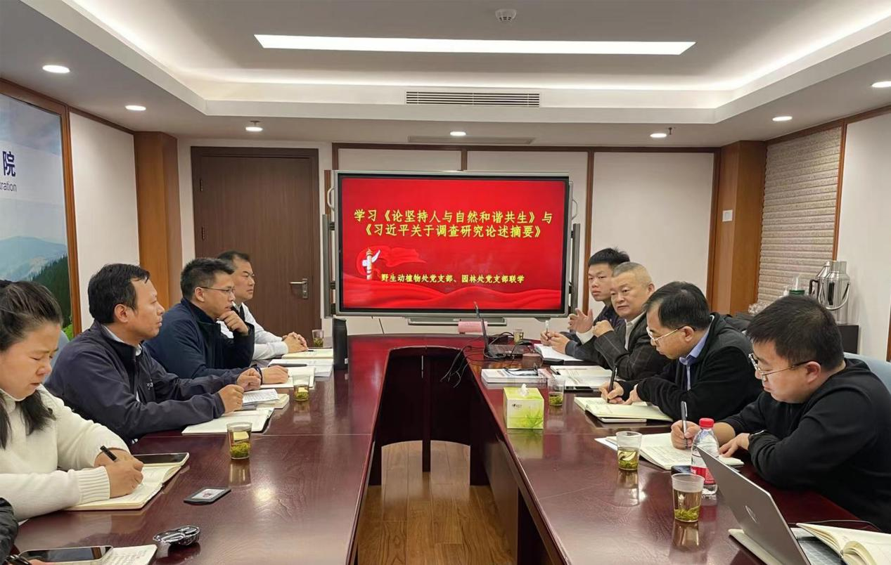 联学活动以两处党支部书记联合主持。园林处党支部书记盛俐领学了《习近平关于调查研究论述摘编》和《论坚持人与自然和谐共生》的相关章节。动植物处党支部阮向东教授以《湖北网湖自然保护区总体规划》项目成果为案例,对如何在业务工作中贯彻人与自然和谐共生、良好生态环境是最普惠的民生福祉、山水林田湖草是生命共同体、用最严格制度最严密法治保护生态环境等重要论述进行了深入的解读。全体党员展开了充分的研讨。