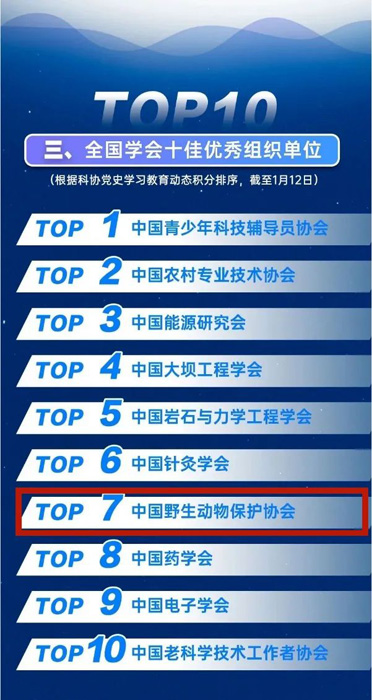 2022年中国科协宣传思想工作会议近日召开,总结表彰了党史学习教育先进单位,形成了全国学会特色榜单。中国野生动物保护协会的党史学习教育数据在全国212家学会中排名第七,荣获全国学会党史学习教育十佳优秀组织单位。