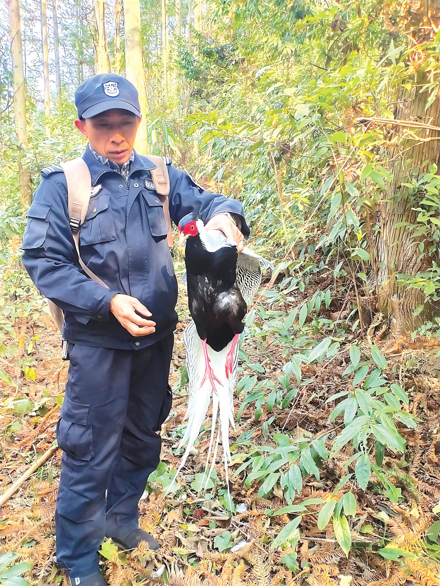 巡山路上,遇到受伤的野生动物是常事。2020年夏的一天,他在港背村后塅组大山里巡山时发现一只美丽的白鹇,翅膀受了伤,无力地蜷缩在灌木下。他小心翼翼地脱下自己的外套,轻轻将它包裹住,像怀抱婴儿一样,一路小跑着下山,四处寻找兽医。“那几天我天天去看它,给它采最新鲜的野果,看着它精神一天天好起来,直到它能重新振翅了,才把它送回原来那片林子。”放归的那一刻,看着白鹇融入林间的身影,他心中才感到真正的踏实。