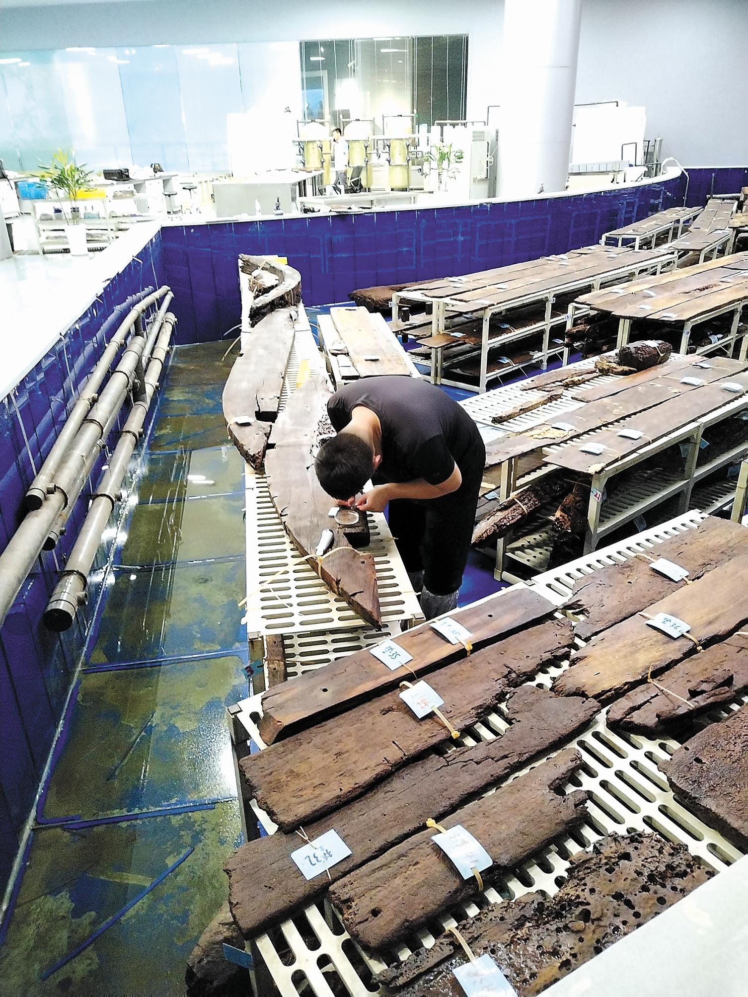 木材研究人员在国家水下文化遗产保护宁波基地对小白礁Ⅰ号 沉船船板进行综合评估 中国林科院木材所供图
