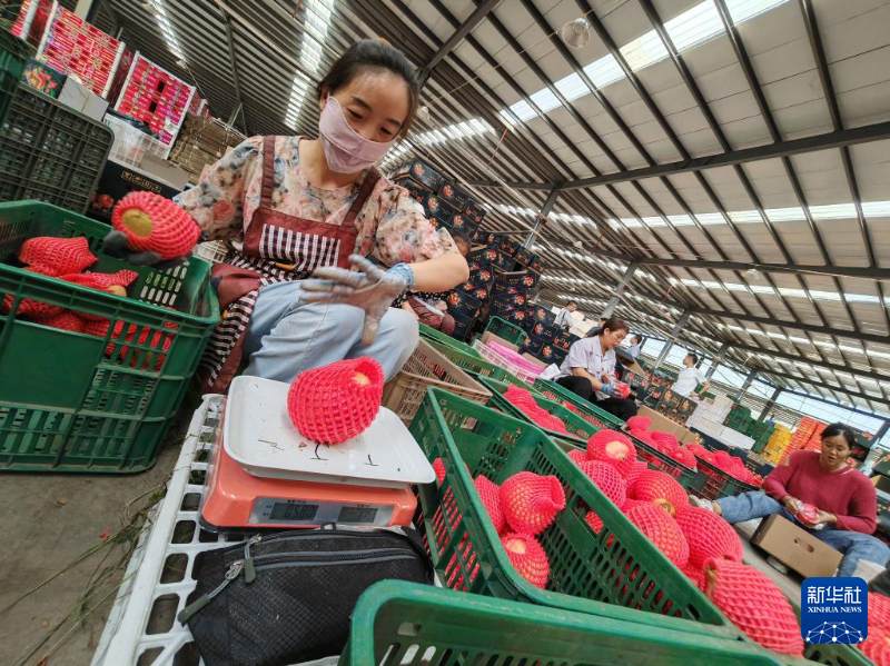 9月19日,会理市鹿厂镇白草村农产品物流园区,务工人员正在分拣石榴果。新华社记者江毅 摄