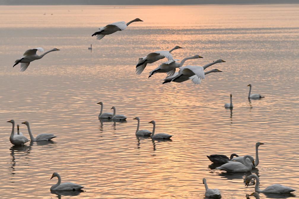 初冬时节,大批大天鹅来到河南三门峡市的天鹅湖越冬。新华社记者吴刚 摄