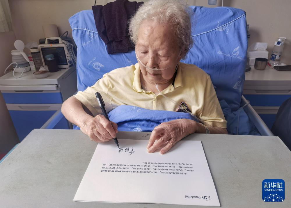 2024年6月19日,金勖琪在病榻上为熊猫社区pandaful留言。新华社发(刘超 摄)