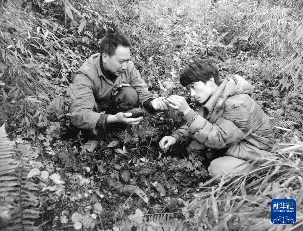 “中国大熊猫之父”胡锦矗(左)和时任“五一棚”(全球首个大熊猫野外生态观测站)负责人王鹏彦(右)一起分析大熊猫的粪团,寻找它们的活动踪迹,以准确地投放补充饲料。