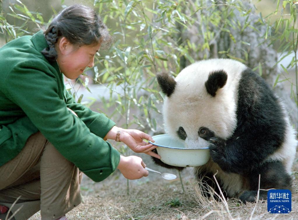 1980年,饲养员给即将送往德国的大熊猫“宝宝”喂牛奶。