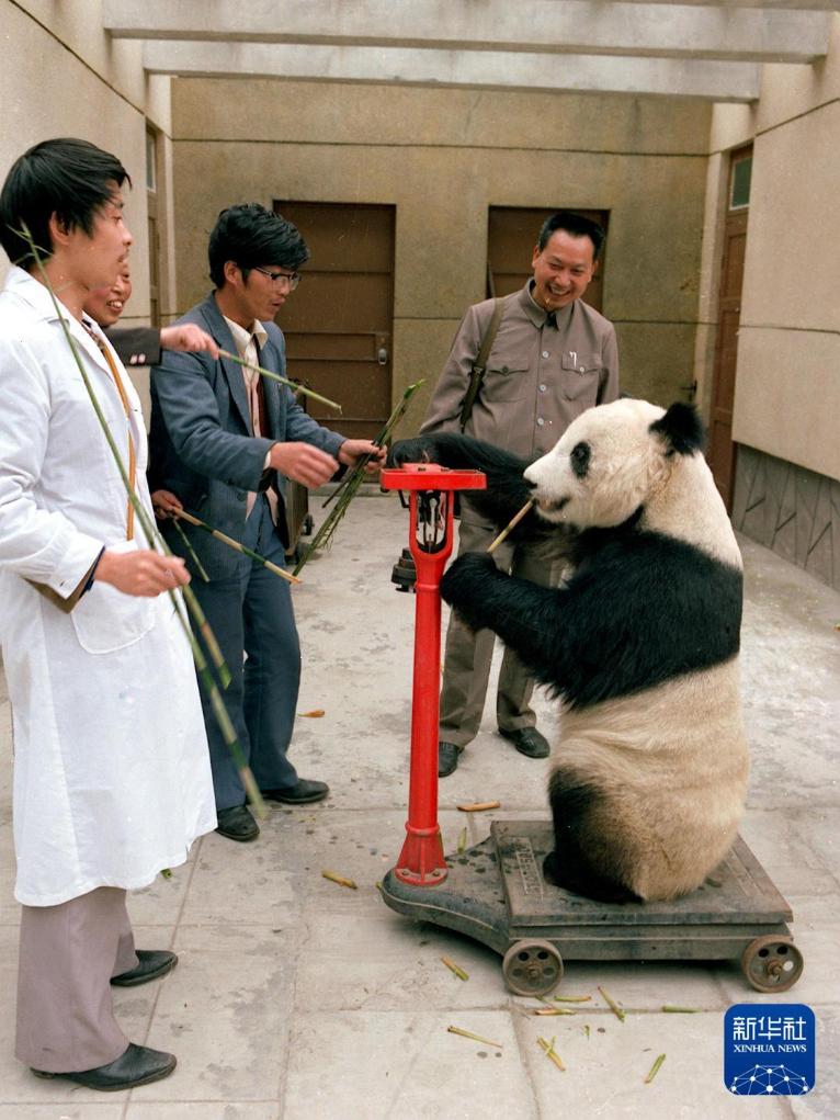 1985年,大熊猫“全全”自己走上磅秤称体重。
