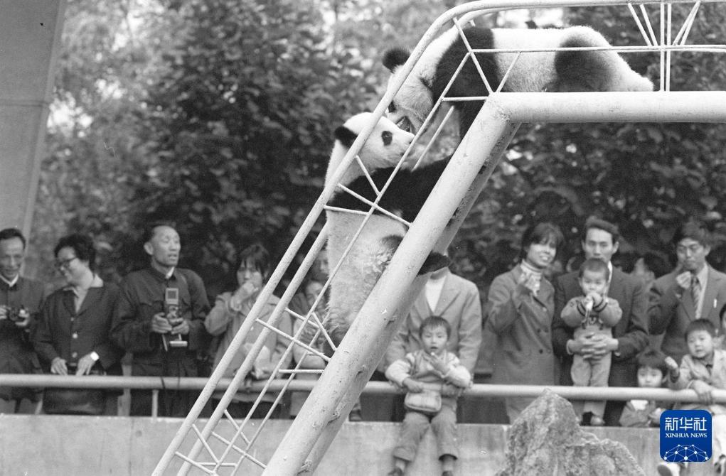 1985年,大熊猫“庆庆”(左下)和母亲“美美”在滑梯上嬉耍。