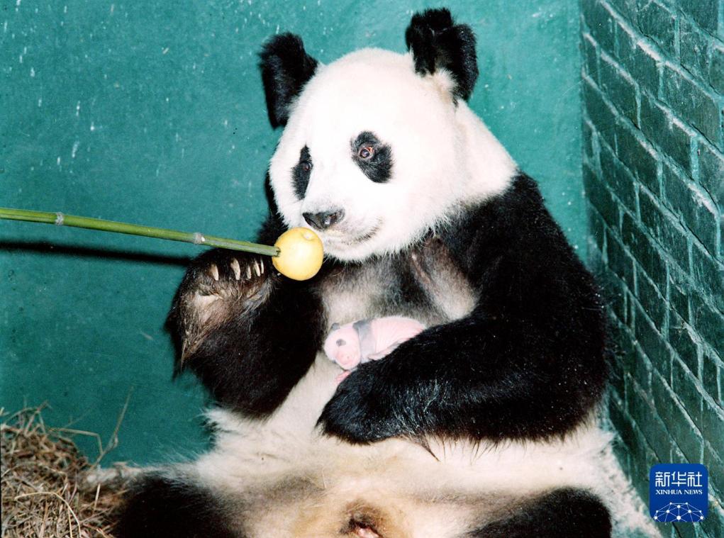1986年,出生20天的大熊猫“都都”躺在母亲“美美”的怀抱里。