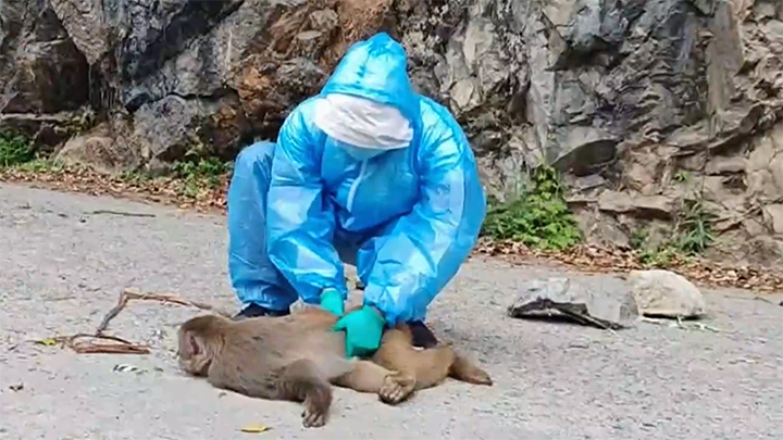 湖北兴山:猕猴坠崖趴公路上无法动弹 众人接力救助