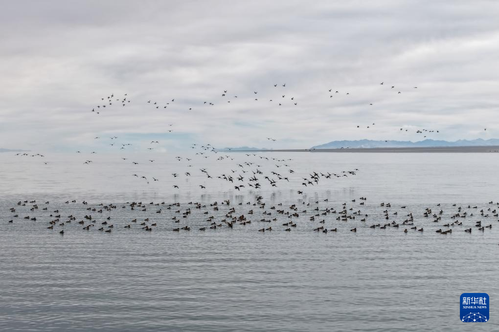 11月16日,一群水鸟在甘肃省阿克塞县大苏干湖省级候鸟自然保护区活动觅食(无人机照片)。