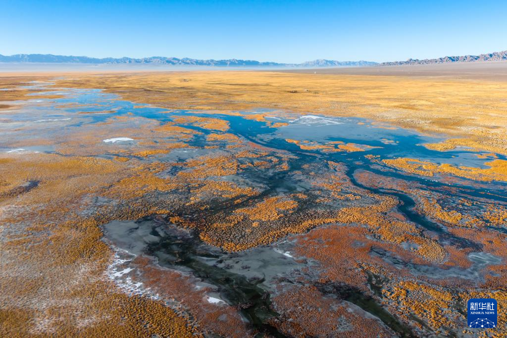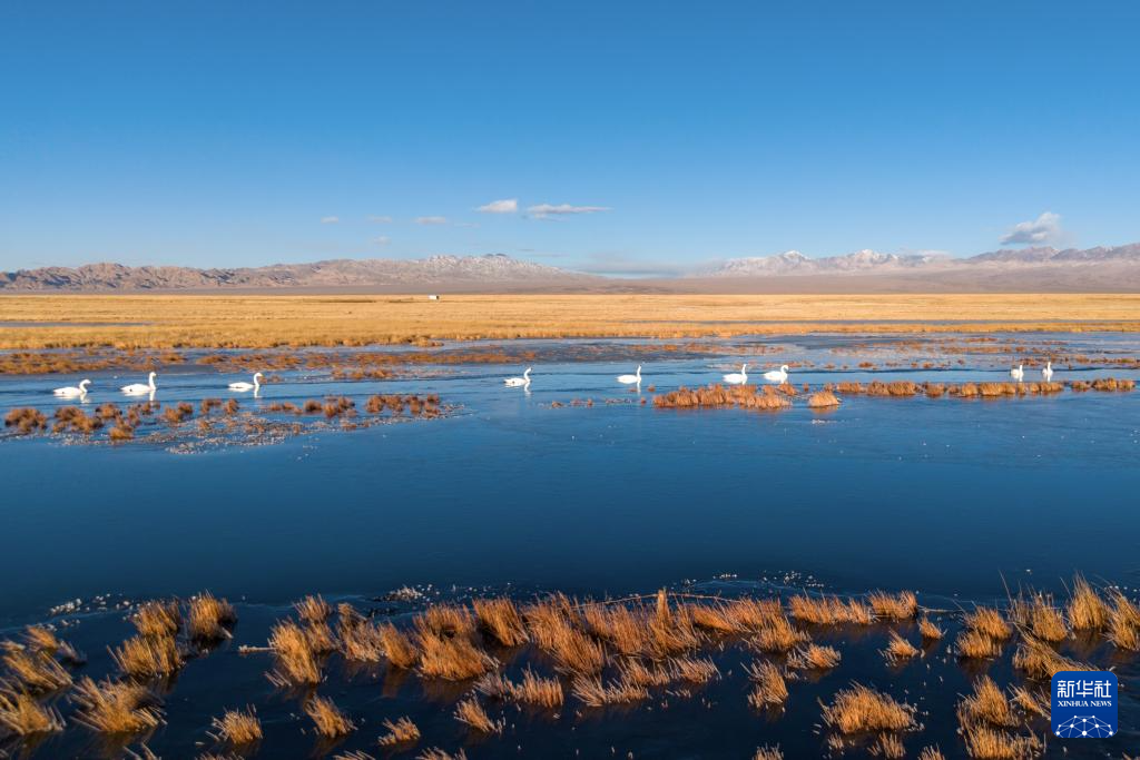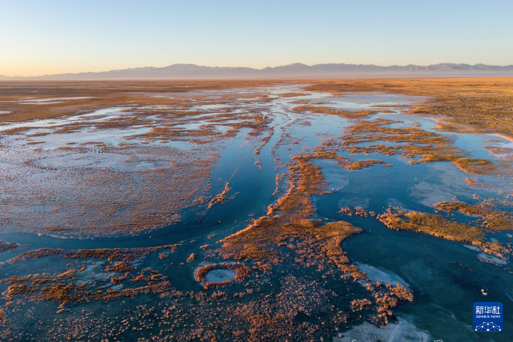 入冬以来,位于甘肃省酒泉市阿克塞哈萨克族自治县境内的“姊妹湖”——大、小苏干湖陆续封冻。澄澈的湖面在阳光下熠熠生辉,犹如镶嵌在西北高原上的璀璨明珠。大、小苏干湖由祁连山冰雪融水汇聚而成,虽一水相连,却呈现“上游小苏干湖为淡水湖、下游大苏干湖为咸水湖”的独特现象。它们共同在广袤戈壁中滋养出一片生机盎然的生态湿地,成为我国候鸟迁徙路线上重要的中转站和繁殖栖息地之一。