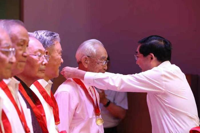 国家林业和草原局党组书记、局长关志鸥,应急管理部党委委员兼国家林业和草原局党组成员、副局长张永利为“光荣在党50年”老党员代表颁发纪念章