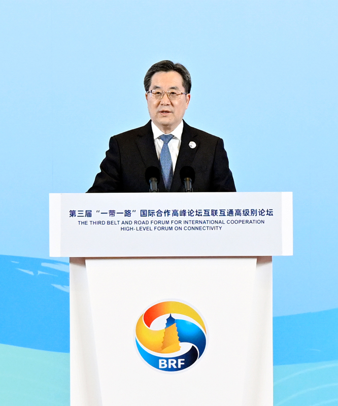 10月18日下午,中共中央政治局常委、国务院副总理丁薛祥在北京出席第三届“一带一路”国际合作高峰论坛互联互通高级别论坛并致辞。新华社记者 殷博古 摄