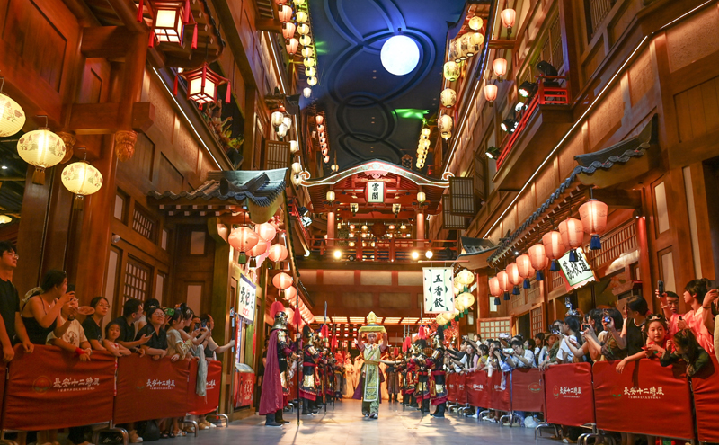 2023年8月2日,游客在长安十二时辰主题街区观看唐风演艺《万邦来朝》。新华社记者 邹竞一 摄