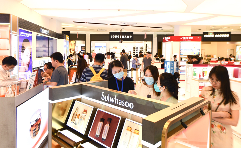 2023年4月30日,游客在中免集团海口日月广场免税店选购商品。新华社记者 杨冠宇 摄