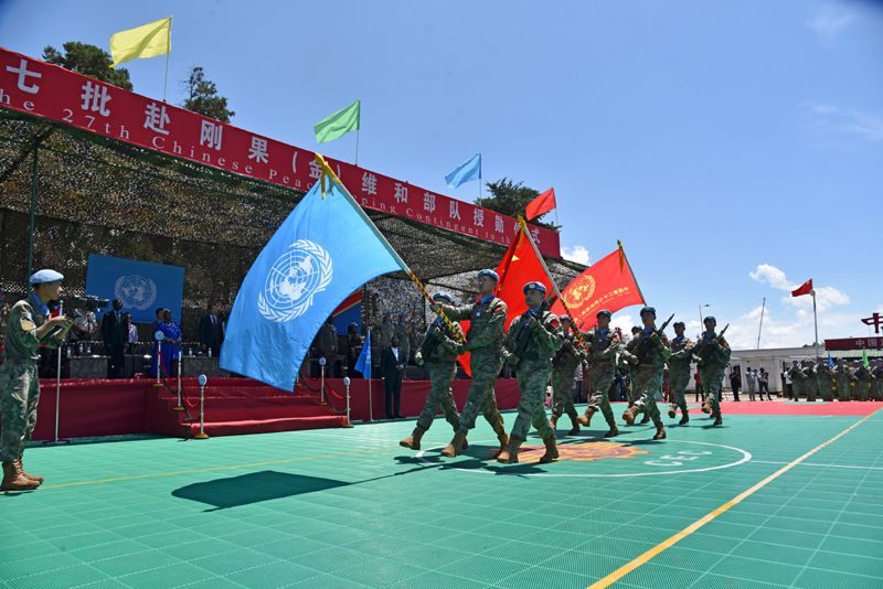 2024年4月9日,在刚果(金)南基伍省布卡武市的中国半岛营区,中国第27批赴刚果(金)维和部队官兵被授予联合国“和平勋章”。新华社发(中国第27批赴刚果(金)维和部队供图)