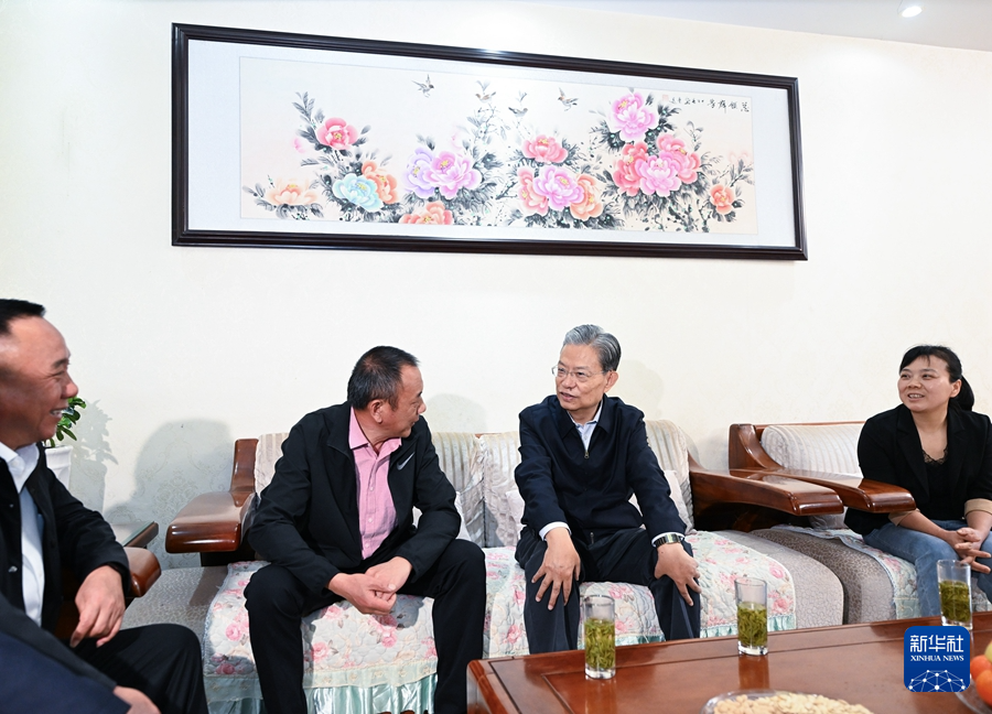 4月14日至17日,中共中央政治局常委、全国人大常委会委员长赵乐际在江苏、安徽调研。这是4月16日,赵乐际在安徽省安庆市宜秀区五横乡杨亭村走访农户。新华社记者 李响 摄