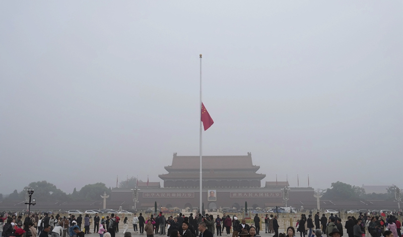 10月14日,为悼念吴邦国同志,首都天安门下半旗志哀。
