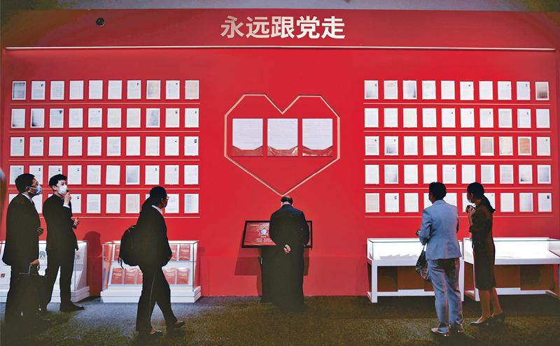 2021年5月24日,“众心向党 自立自强——党领导下的科学家”主题展在北京中国国家博物馆开幕。图为开幕当日,人们在观看钱学森等100位科学家的入党志愿书。 新华社记者 金良快/摄
