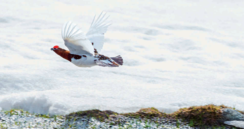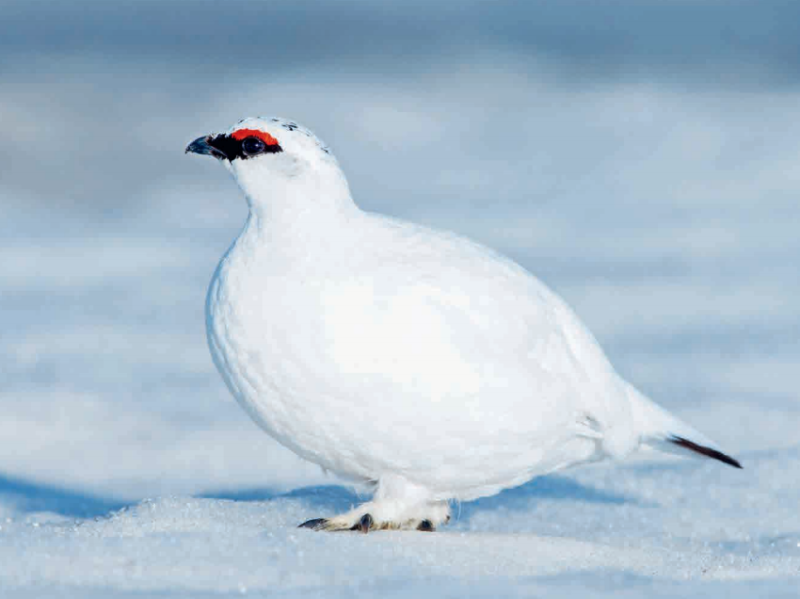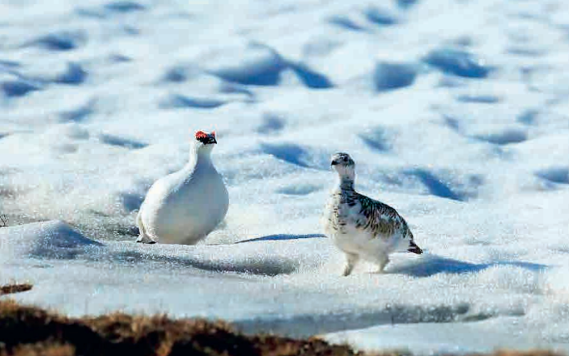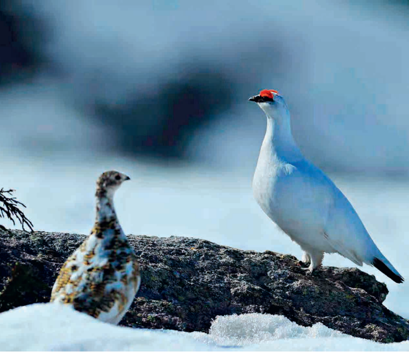 岩雷鸟和柳雷鸟性格迥异。一只岩雷鸟慢慢走到你面前时,你会情不自禁地陶醉其中,开始是因为它洁白的羽毛、鲜红色的眉瘤和黑色的尾羽,黑白红这3种色调格外吸睛,然后它犹如一位温文尔雅的绅士缓慢地行走在冰面上,此时,你感受到的是安静和纯净,这种美、这种静只属于这一刻。