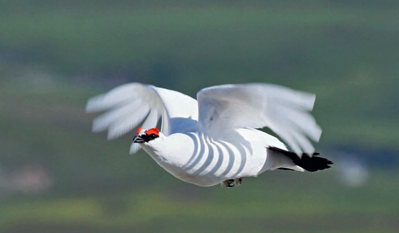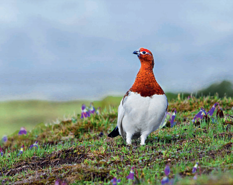 繁殖季,雄性岩雷鸟眼睛上面的肉冠膨大,色彩变为鲜艳的血红色。如果有其他雄鸟入侵时,它们会将肉冠竖起,尾羽敞开,立刻飞过去驱赶,领域性极强。(刘璐摄)