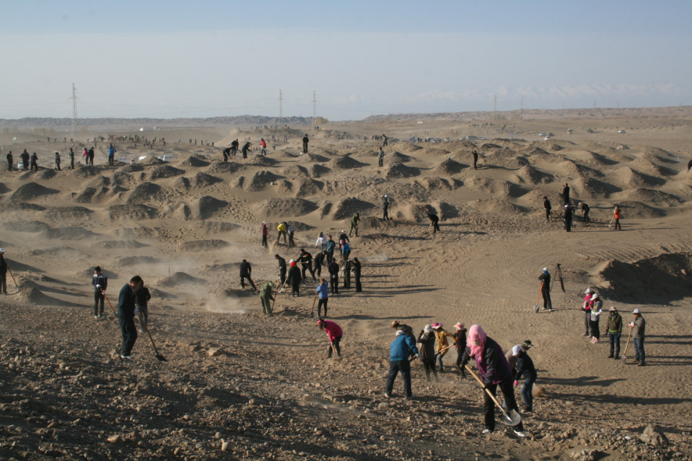 金核公路沿线一派火热劳动景象。大家拉草埋沙,或俯身铺草,或挥锹压埋、填沙整型。一台压沙车正在作业,车轮驶过,稻草沙障便被植入沙漠里,划线、铺草、压草,整个流程一气呵成。随着马达的轰鸣,稻草网格不断向远处延伸,形成一张巨大的“金网”,牢牢锁住了流动沙丘。另一边,挖穴换土工程也如火如荼展开,挖掘机、装载机等机械轮番作业,挖坑、铲土、填土、测量……