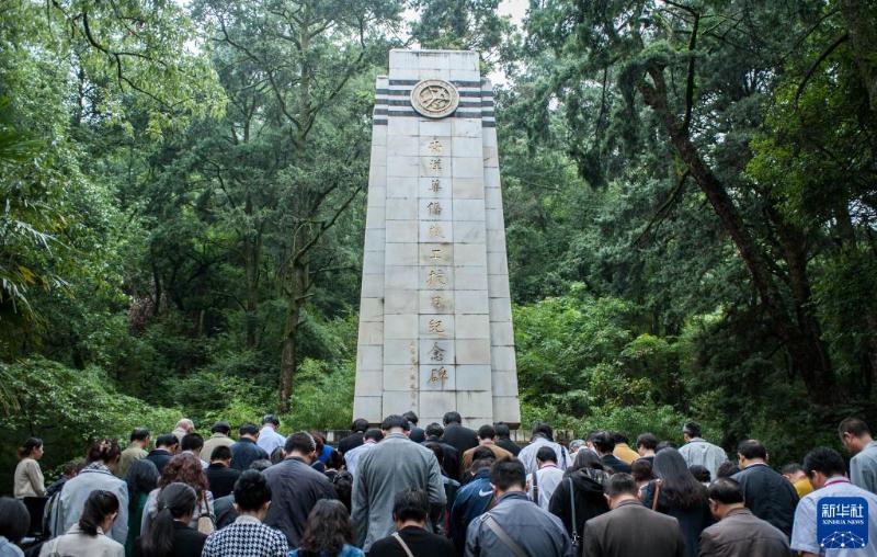 参加南洋华侨机工抗日纪念碑瞻仰活动的全体人员在云南省昆明市西山森林公园的南洋华侨机工抗日纪念碑前默哀(2015年9月8日摄)。新华社记者 吕帅 摄