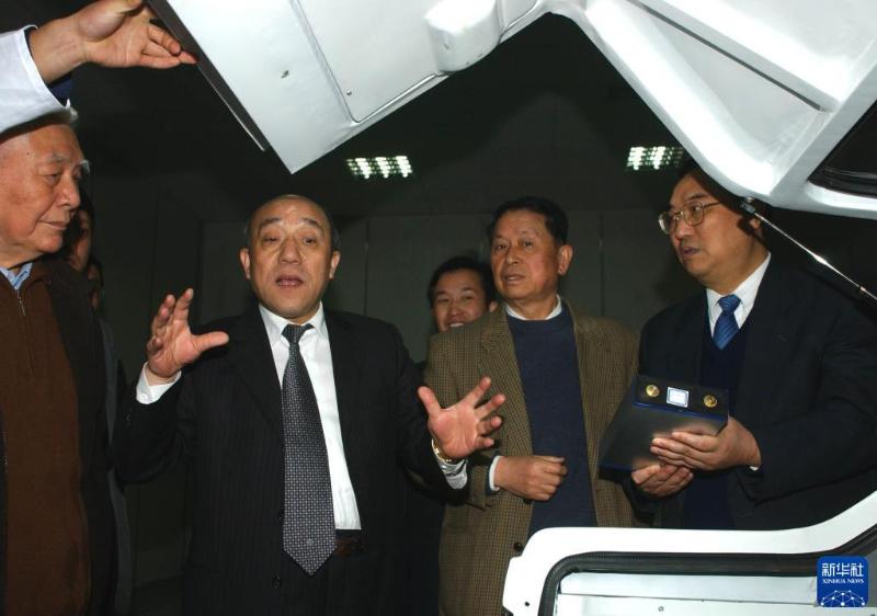鲁冠球(左二)向参观者介绍万向集团研发电动汽车的情况(资料照片)。新华社发