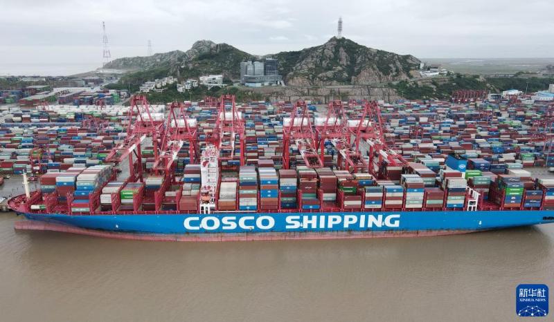 中远海运“天秤座”轮停泊在上海洋山港二期码头(10月13日摄,无人机照片)。新华社记者 方喆 摄