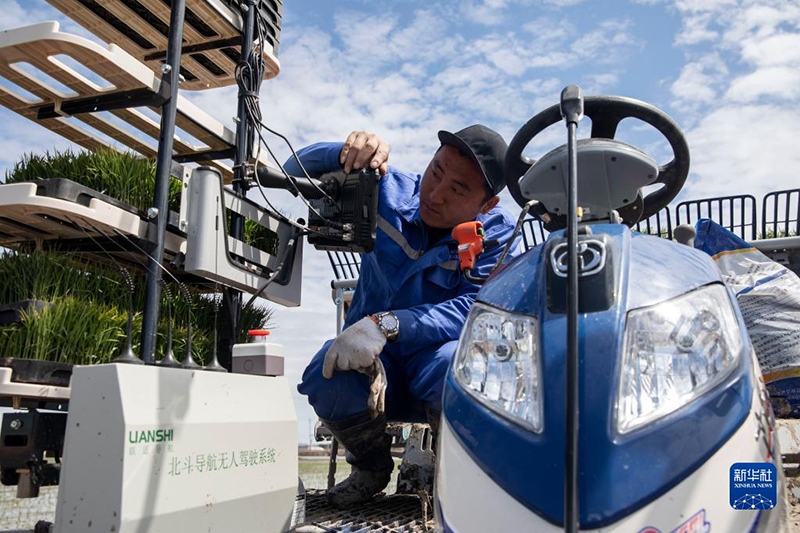 在北大荒集团红卫农场有限公司智慧农业先行示范区内,工作人员设置无人驾驶插秧机工作路径(5月11日摄)。据介绍,无人驾驶智能插秧机应用北斗卫星定位系统,田间作业时可实现自动避障、掉头和转弯。新华社记者 张涛 摄