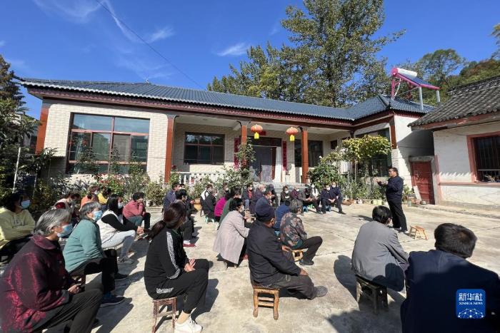 11月18日,在甘肃省陇南市成县店村镇卯堡村,驻村干部通过“农家板凳会”的形式开展党的二十大精神宣讲。新华社发