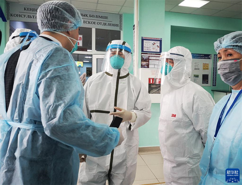 2020年4月14日,在哈萨克斯坦努尔苏丹第九综合医院,中国援哈医疗队成员与哈萨克斯坦医护人员交流如何优化医院管理减少院内感染。新华社发(哈萨克斯坦实业报供图)
