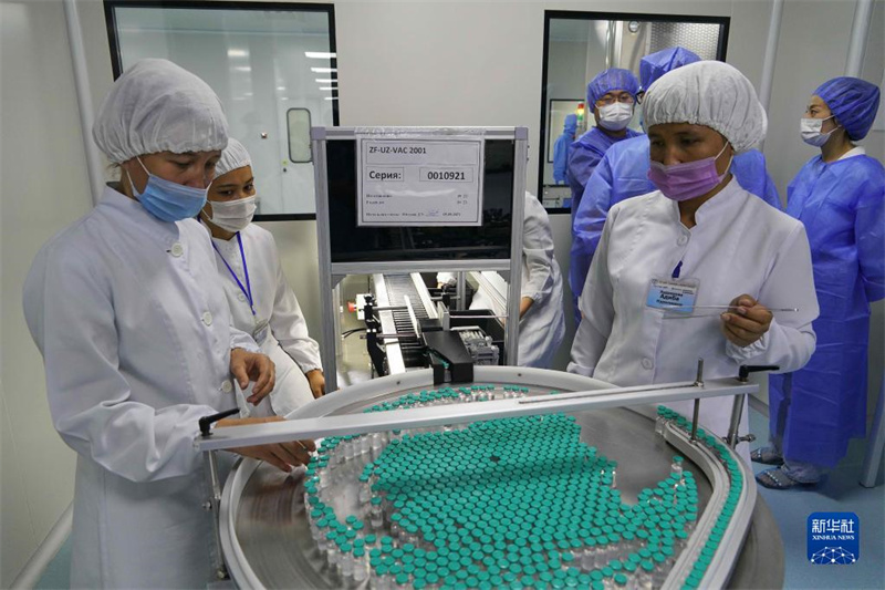 2021年9月5日,在乌兹别克斯坦制药企业祖拉贝克实验室有限公司,工作人员在新冠重组蛋白疫苗生产线上工作。由中国科学院微生物研究所和安徽智飞龙科马生物制药有限公司共同研发的新冠重组蛋白疫苗在乌兹别克斯坦制药企业祖拉贝克实验室有限公司正式投产,这是该国首次实现中国新冠疫苗本地化生产,也是该款新冠重组蛋白疫苗的生产线首次在国外落地。新华社发(扎法尔摄)