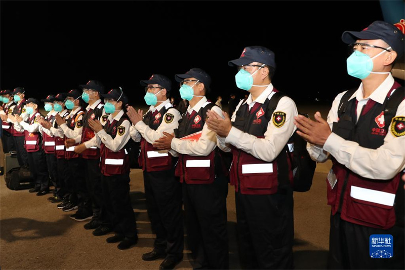 2020年4月20日,在吉尔吉斯斯坦首都比什凯克玛纳斯国际机场,中国赴吉尔吉斯斯坦联合工作组成员走下飞机。联合工作组随机携带了由新疆维吾尔自治区捐赠的一批抗疫医疗物资。新华社发(罗曼摄)